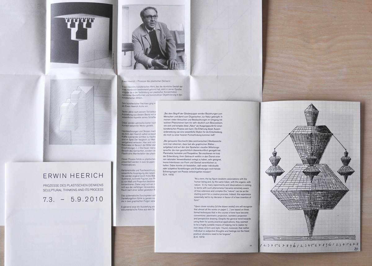 The Erwin Heerich exhibition in the Siza Pavilion, Hombroich, is another example of an exhibition concept that also includes the communicative media, such as the catalogue booklet, invitation and leaflet. Erwin Heerich’s artistic work is of central importance for Stiftung Insel Hombroich.