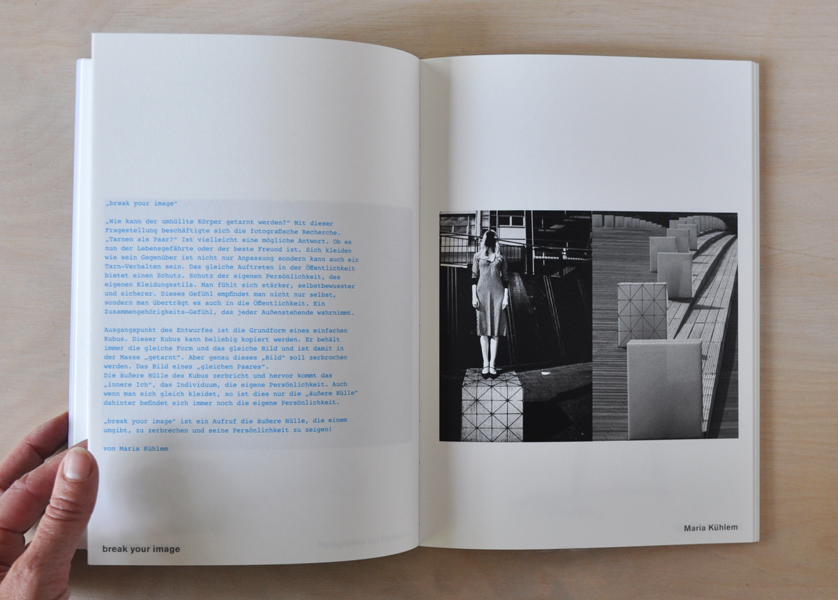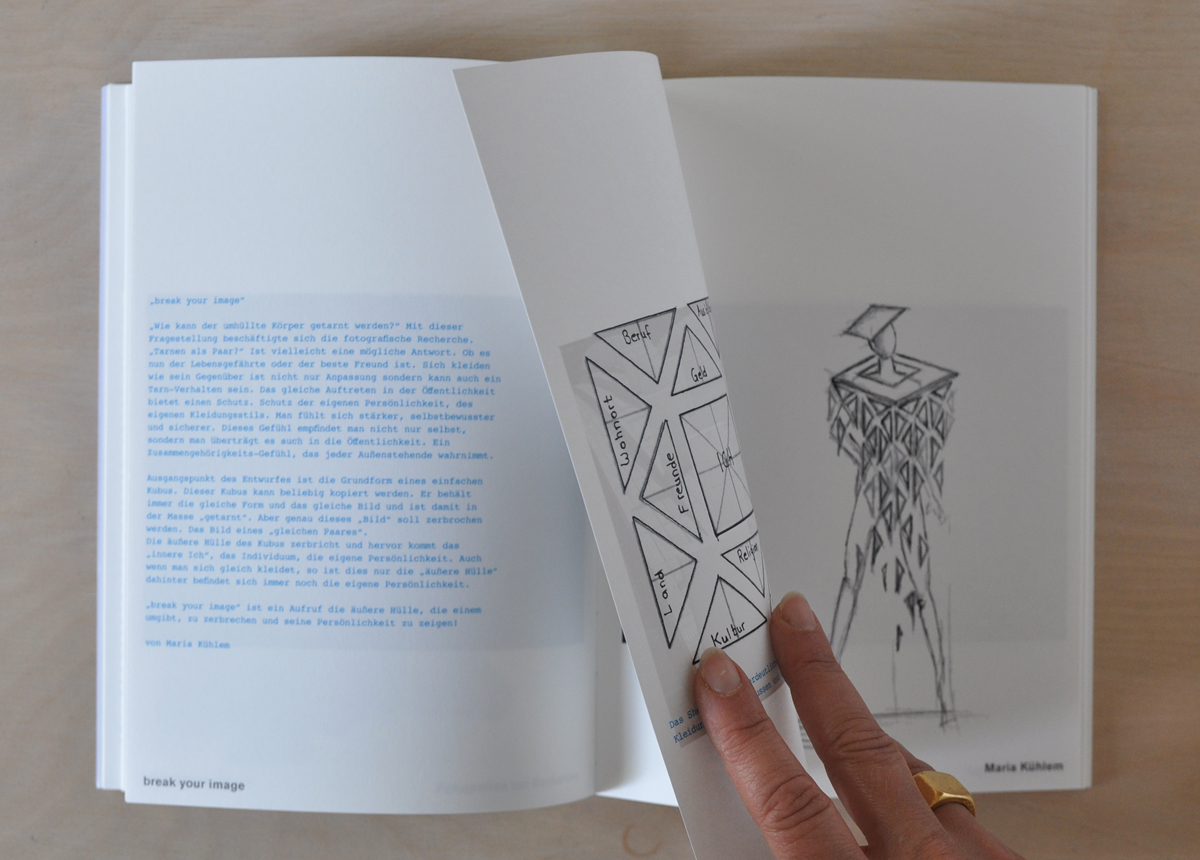 How can the enveloped body be camouflaged, and be made to disappear? The cover works like a cloak of invisibility, its inside is no longer visible. This is of course preceded by the question - why the body wants to be camouflaged. The desire for a shelter for the psyche was discussed. Within this field of questions the students pursued different aspects of camouflage in their project: One student dealt with the veiling imposed for religious and cultural reasons. Two other designs offer solutions to the desire to temporarily disappear into the crowd, to carry around a private room that can be used according to the occasion. Another aspect pursued was the desire to disappear into the background, to be absorbed by the structure, the pattern of the background. One student pursued the function of the doppelganger, the one who camouflages the person being copied. In this sense the plagiarism, the copy, and then the copy of the copy, which scatters the message of the actual object. One student referred with her object to the voluntary uniform, the partner look or the "look" of a whole group, which makes the individual submerge. Her object represents a request to break up this uniform, to leave anonymity. A contemporary project dealt with the coat for the city nomad who does not want to attract attention, collects deposit bottles and needs daily shelter. A student illustrated the privacy of the coat by exchanging typologies. She translated the surface of the wall into a dress. The dress, like the wall, is "tagged" with the airbrush, an invasion from outside to the immediate private cover. Naturally, such a dress makes its wearer disappear in front of a corresponding wall; it functions as a magic hood. Some of these projects address issues of greater significance and could easily be extended to longer-term confrontations with the subject.