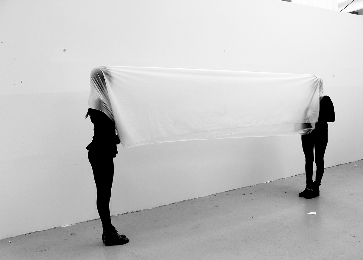 This was followed by an experimental impromptu investigation of textile spaces in the room, documented in photo series. Various qualities of textiles were presented, from transparent light fabrics, foamed stiff material to heavy, dense textiles. This investigation resulted in a catalogue of requirements: What can textile spheres do in space.