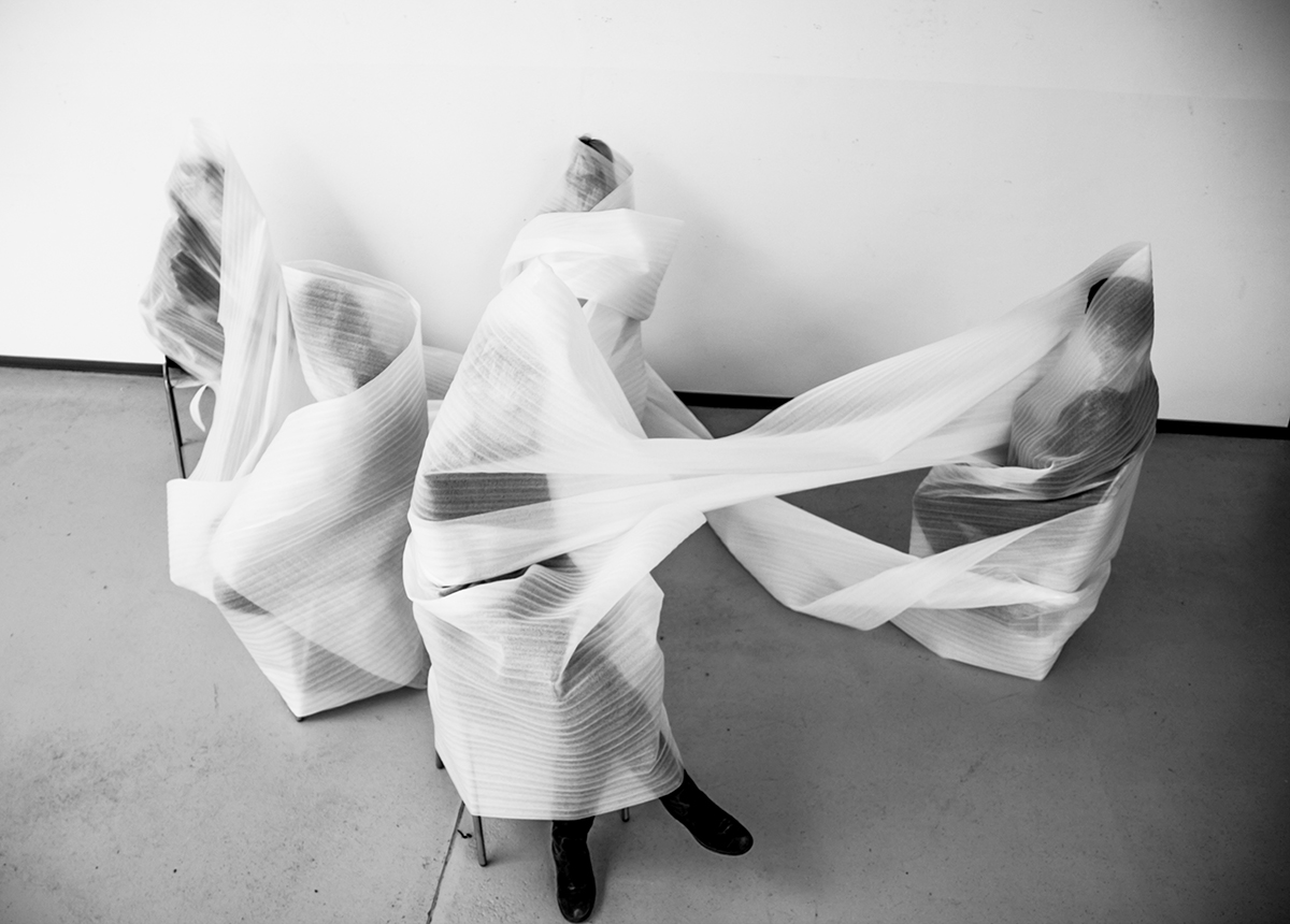 The title of this long-term project, which resulted in a presentation of prototypes, was „Body Coverings: Textile Spheres in Space“. The sphere of the individual in the surrounding room, in this example of the new rooms of the NDU in the former factory “Glanzstoffwerke”.