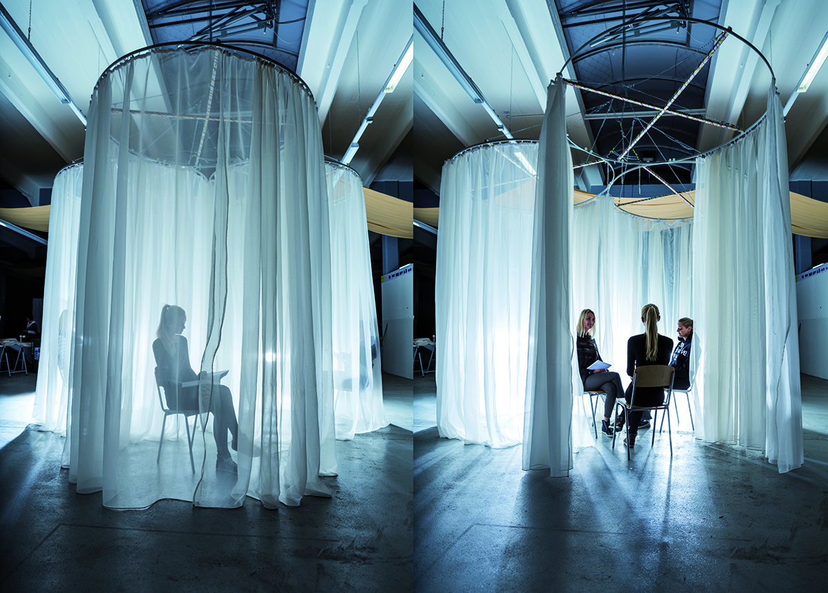 On the basis of this preliminary work, we dealt with the design project, the formation of spheres, of spaces in the room, which are related to their user. The different demands on these spheres were worked out, whether they are for working, for retreating, for communicating or for contemplating. It was investigated to what extent textile spaces can fulfil these tasks, which are mobile, temporary or changeable. The aim was to develop 1:1 real size models. Thus it could be shown how these developed textile spaces communicate and what kind of atmosphere they can create.
