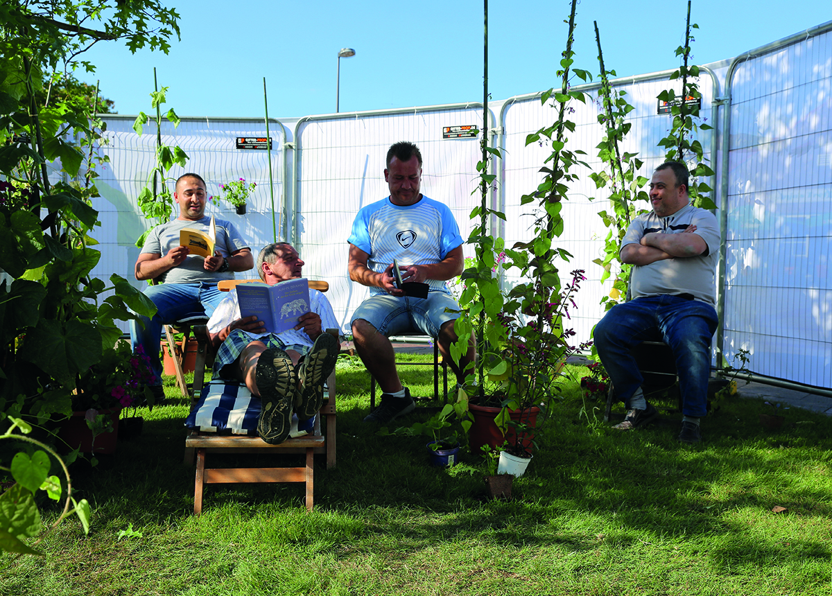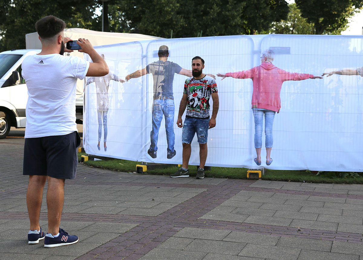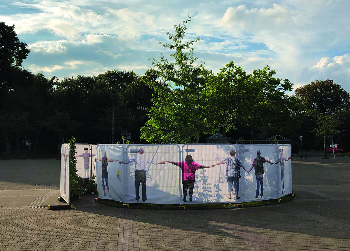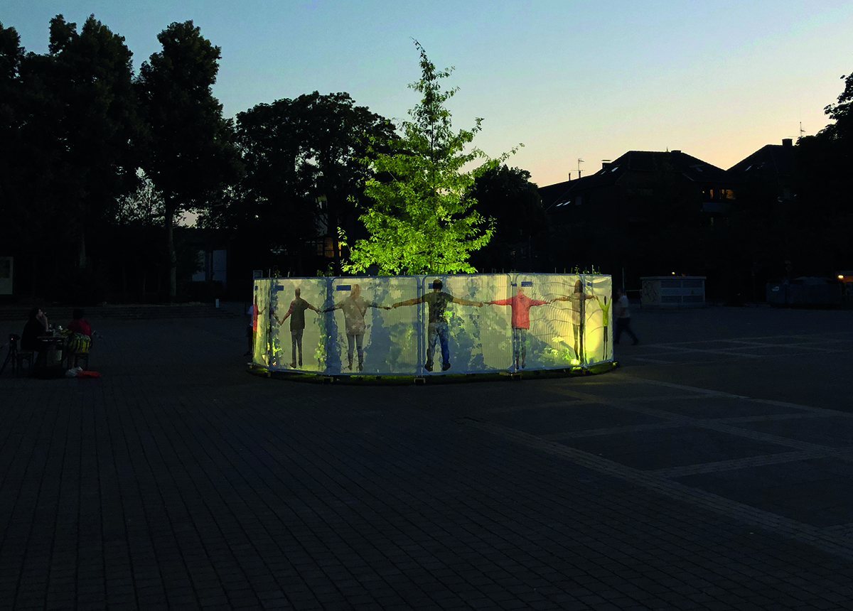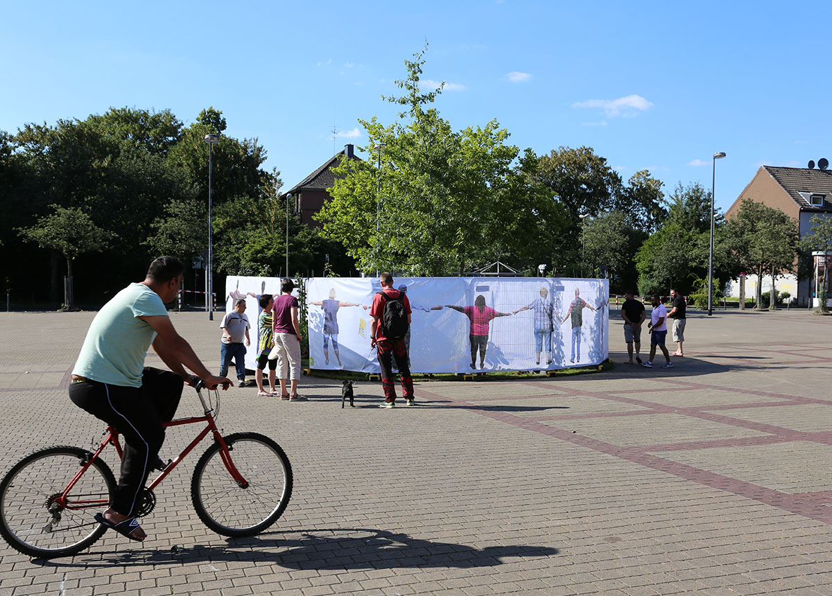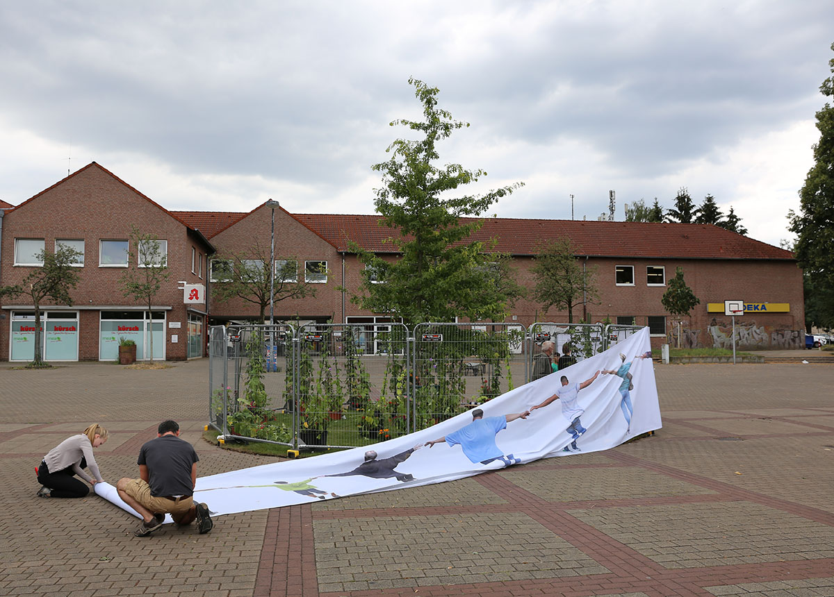 Connected with the participative art project hOme sweet hOme we‘ve planned several exhibitions in Schonnebeck that reflected and explored the nature of the private living-space, the immediate surrounding of the people in Zollverein district. Our main installation, a hidden paradise took place at the Karl-Meyer-Platz market place where in former times a market fountain stood. The paradise, a garden oasis with a tree, plants and flowers was surrounded by a fence of printed, semi-transparent, fabric that depicted the inhabitants of Schonnebeck with arms held out to form a protective chain of people.