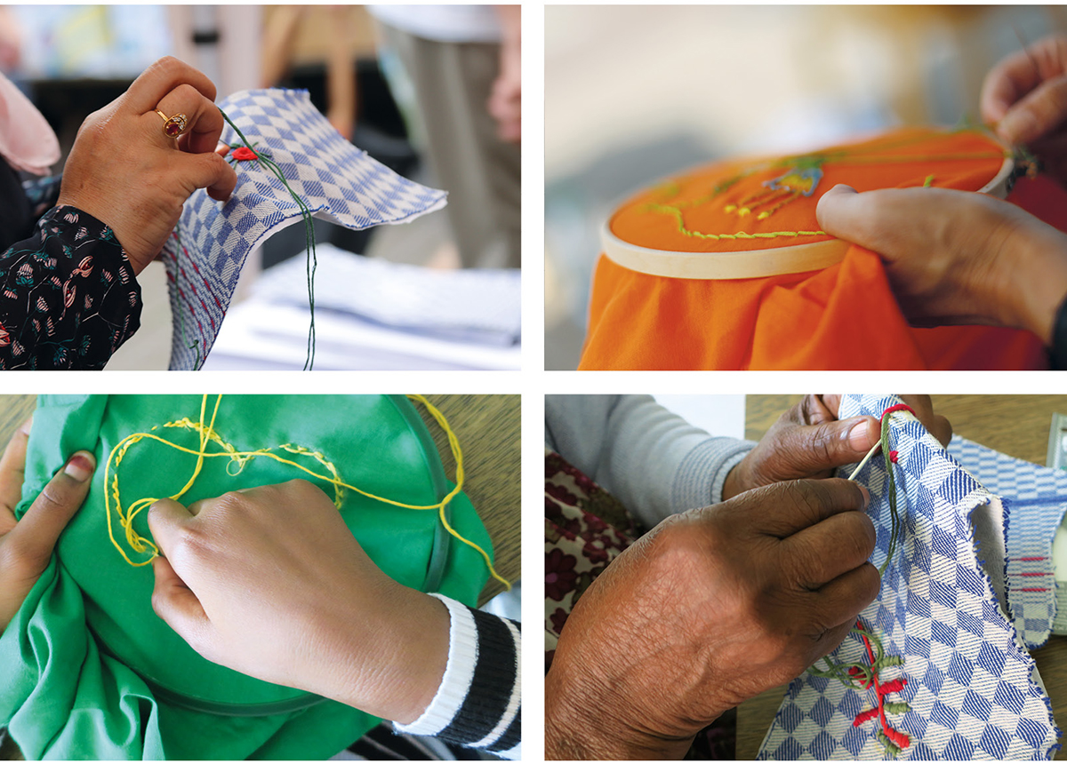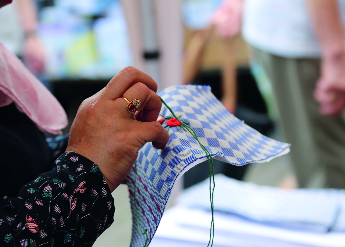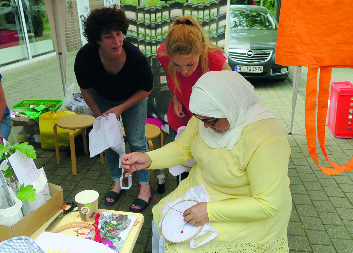 From this cloth we produced hats as a symbol of caring and protecting. Then we embroidered on these hats with the growing plant motifs. The embroidery workshops in the market and the refugee home became almost meditative and radiated a sense of calm. Passers-by approached us and asked if they could take part. At first, the participants were mainly children but after a while people of all ages, ethnicities and from all sections of society took part.