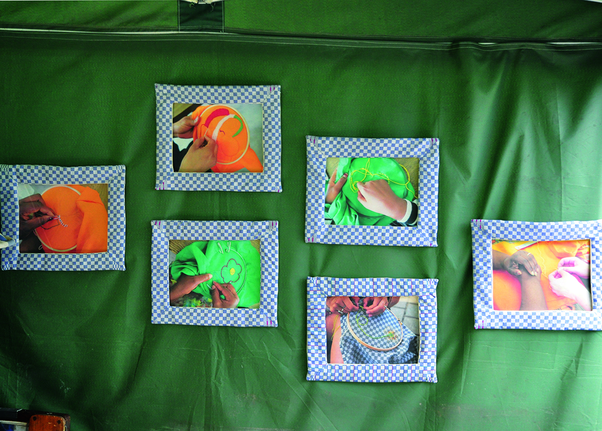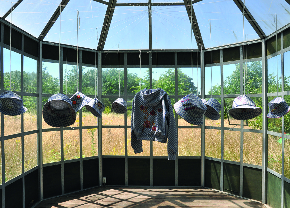 The themes of embroidery are plants and flowers , which symbolically grow on traditional cloth. From this cloth we produced hats and jackets as a symbol of caring and protecting. They were exhibited in the flourishing surrounding of an urban gardening project that we also wanted to promote in the community.