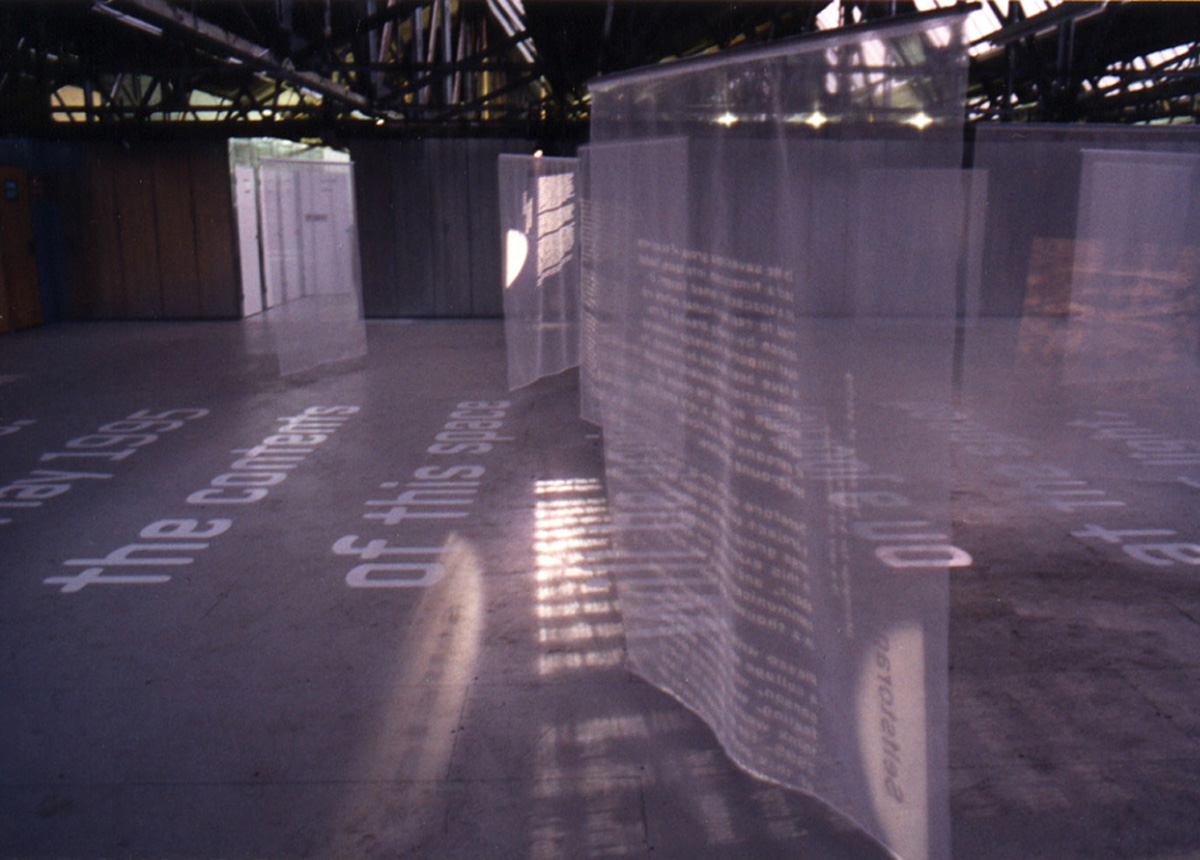 Diaprojektoren frei in den Raum projiziert. Die Projektionen wurden von bewegten, im Raum verteilten Gazepanelen aufgefangen. Der leere Raum war angefüllt mit Information, die man nur durch Bewegung erfahren konnte.